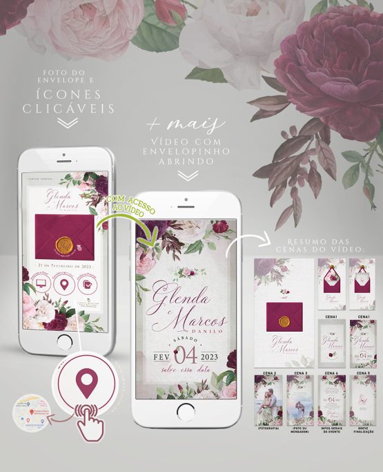 Modelo 0023: “Marsala🌺🌹🌿” | Convite com envelope abrindo! Ícones clicáveis que abrem mapas, lista de presentes, confirmação e mais!