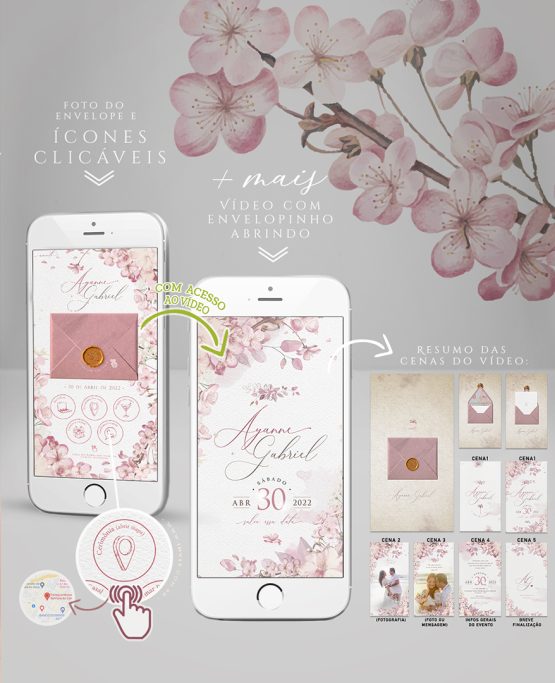 Modelo 0030: “Cerejeiras🌸” | Convite com envelope abrindo! Ícones clicáveis que abrem mapas, lista de presentes, confirmação e mais!