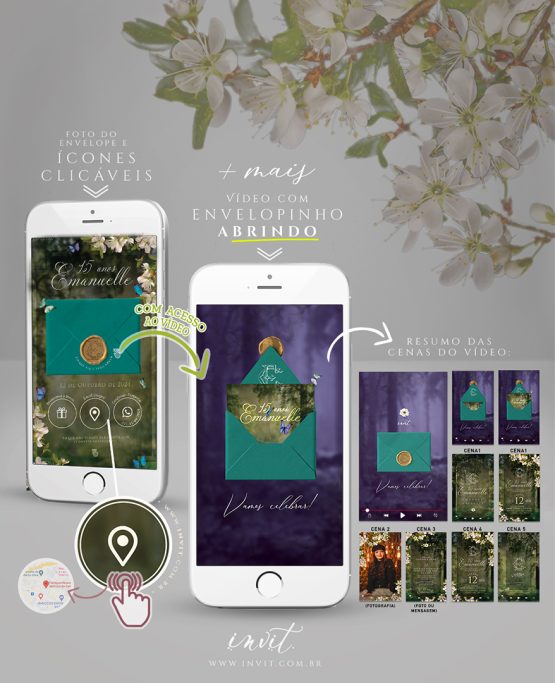 Modelo 0214: “Floresta Encantada” 🤍 🌿🦋 | Convite com envelope abrindo! Ícones clicáveis que abrem mapas, lista de presentes, confirmação e mais!