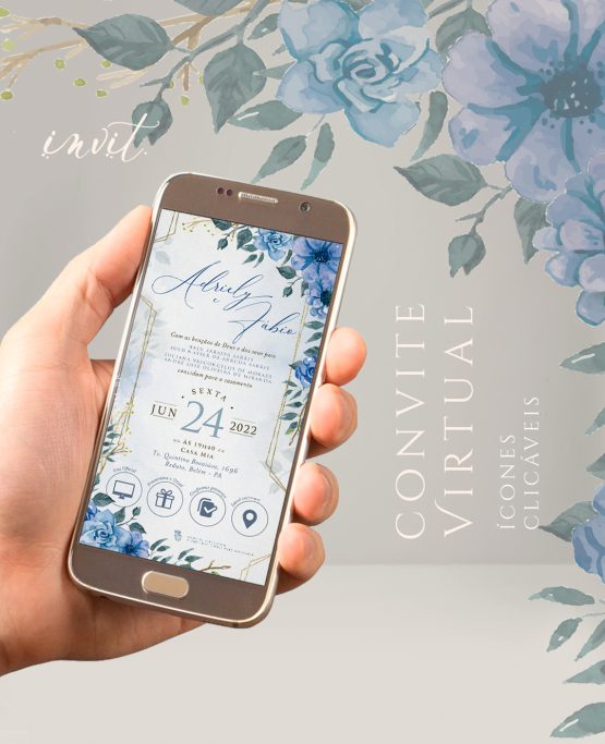 Modelo 0019: “Blue Flowers💙💐” | Convite com botões interativos (Ícones clicáveis) que abrem mapas, lista de presentes, confirmação e mais!