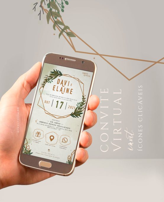 Modelo 0004: “Geometric💎"🌿 | Convite com botões interativos (Ícones clicáveis) que abrem mapas, lista de presentes, confirmação e mais!