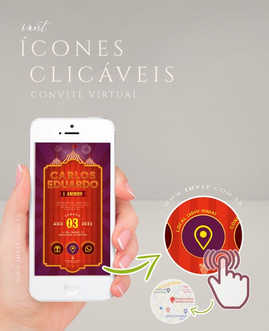 Modelo 0106: “Circus 🎪” | Convite com botões interativos (Ícones clicáveis) que abrem mapas, lista de presentes, confirmação e mais!