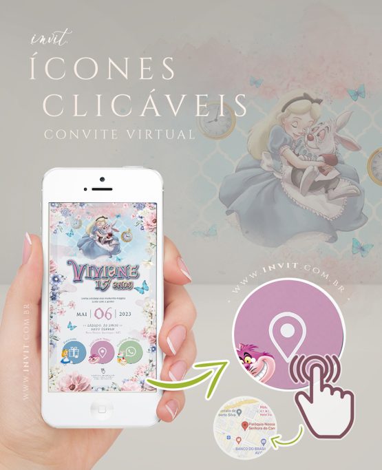 Modelo 0114: “Alice no país das Maravilhas, Infantil (desenho) 🌸⏰💙” | Convite com botões interativos (Ícones clicáveis) que abrem mapas, lista de presentes, confirmação e mais!