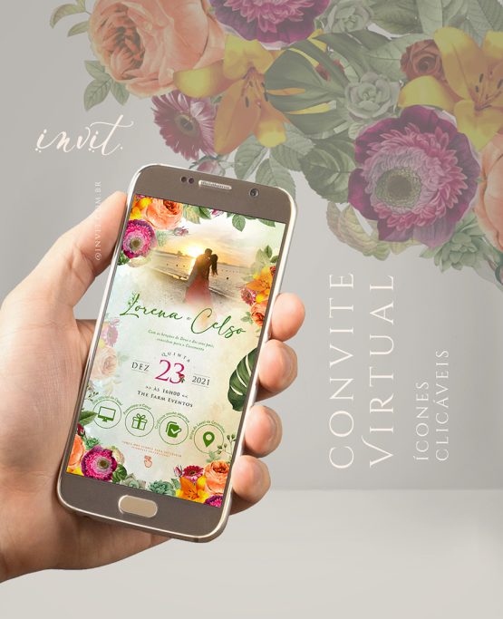 Modelo 0031: “Protea🌹” Variação Colors | Com foto! Convite com botões interativos (Ícones clicáveis) que abrem mapas, lista de presentes, confirmação e mais!